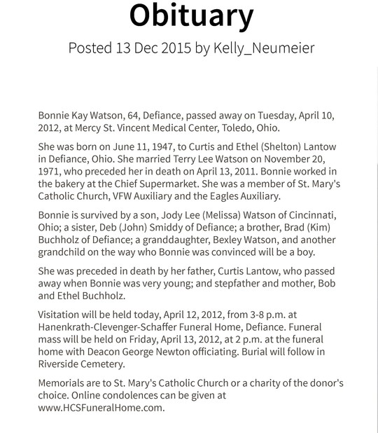 Bonnie Lantow Watson Deceased Defiance Oh Ohio